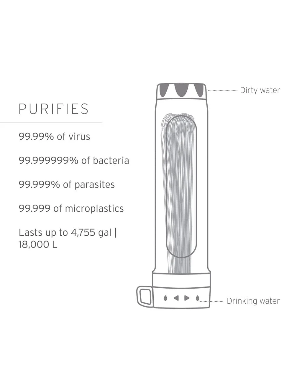 - REMOVES VIRUS, BACTERIA + PARASITES: the Ultrafilter Membrane protects against viruses (Rotavirus, Hepatitis A), Bacteria (including E.coli + Salmonella), Parasites (including Giardia and Cryptosporidium), Microplastics, sand, dirt, and cloudiness